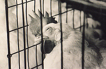 The student experiment at Cal Poly is now officially over to our knowledge. Future experiments are said not to be planned or the lenses to be recommended for commercial use. In January 1992, about 400 of the original 1,000 hens were estimated to remain in the poultry unit waiting to be "phased out," i.e., sent to slaughter. Contacts with school official initiated by UPC and Action for Animals' Rights (AFAR), a group based in Atascadero, CA, have not, in our opinion, resulted in a responsible show of concern for the welfare and suffering of the hens. For example, during the experiment the hens did not receive, nor do they now receive, veterinary care and treatment of their eyes, according to our sources of information. In July 1991, a concerned citizen removed several of the experimental hens from the poultry unit at Cal Poly. Photographs were taken of the hens in the unit and of those who were removed. The hens were taken to Dr. Nedim C. Buyukmihci, V.M.D., Associate Professor of Ophthalmology in the School of Veterinary Medicine at the University of California, Davis. Dr. Buyukmihci's July 25, 1991 report on his examination of these hens supports his earlier one based on his examination of a pair of lenses. He explains that "The red plastic lenses are at the very least uncomfortable for the chickens. These red plastic lenses also appear to cause corneal ulcers. In the worst case, these ulcers can rupture and lead to blindness. Pain always is a significant component of corneal ulcers or ruptured eyes." Dr. Buyukmihci also expressed concern over the fact that these non-biodegradable lenses are to be disposed of by being ground up along with the chickens' heads, which means they would be recycled back into farm animal and pet food. This could present serious health, safety, and environmental hazards, particularly in large-scale production.