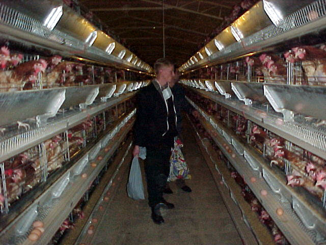 Photo 1 Michael examines hens in fairly new battery hen shed in Victoria Australia. Photo: Patty Mark/Action Magazine